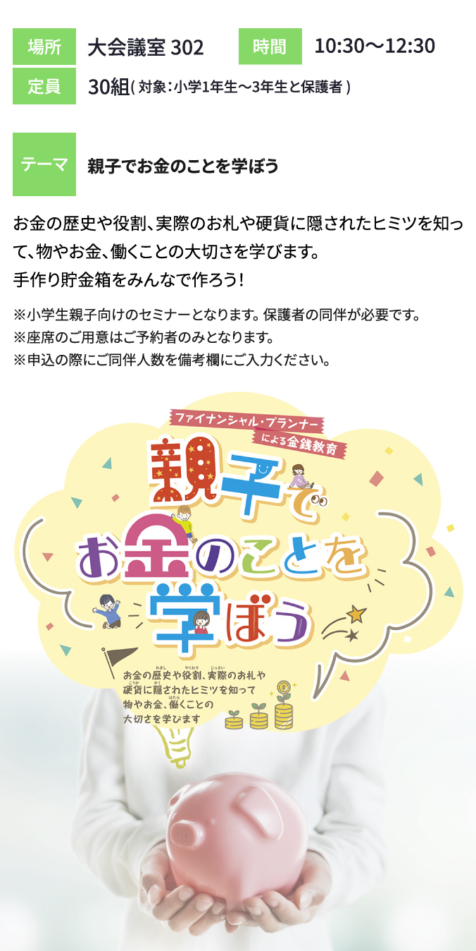 お金の歴史や役割を学びながら、お札や硬貨に隠れたヒミツを発見!親子で楽しく体験し、物やお金、働くことの大切さを知り、最後はワクワクの手作り貯金箱づくり!