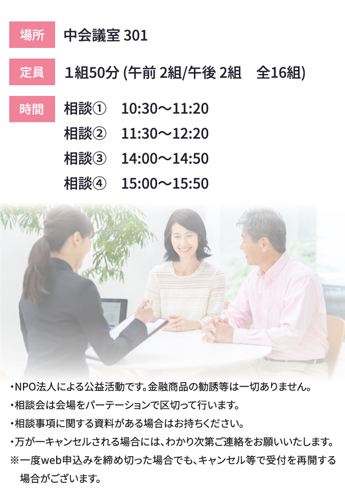 FP(ファイナンシャルプランナー)が、あなたのライフプランに合わせた資産形成の考え方をわかりやすくアドバイスします。新NISAや年金、老後資金の準備まで、具体的に数字を用いて体験できる相談会です。未来を築く第一歩を、ぜひこの機会に体感してください。